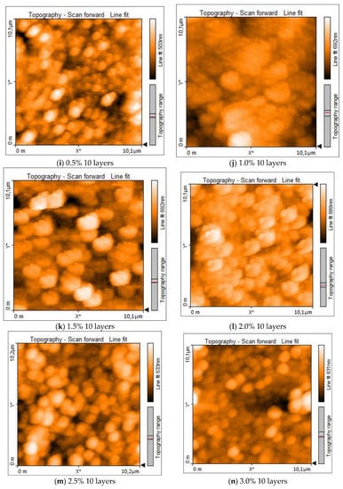 Images from AFM, Figure 2, were used to study the morphology for the 5- and 10-layered CuO films with various Sn doping concentrations.