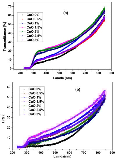 From the transmittance curves, Figure 3a,b, the films exhibited an average transmittance of 65% at waves longer than 800 nm. The abrupt drop in transmittance for waves shorter than 780 nm corresponded to the absorption in CuO due to electronic transitions between the valence band and the conduction band. At wavelengths 300 nm or lower, the transmittance values were close to 0. The results are consistent with earlier reports for pre-annealed CuO films [28].