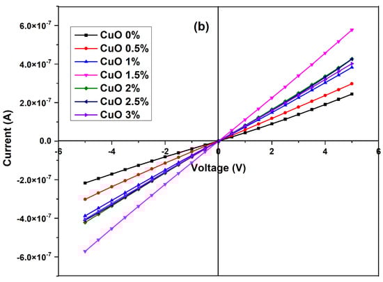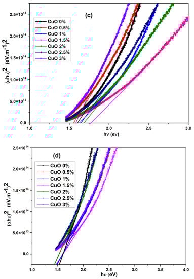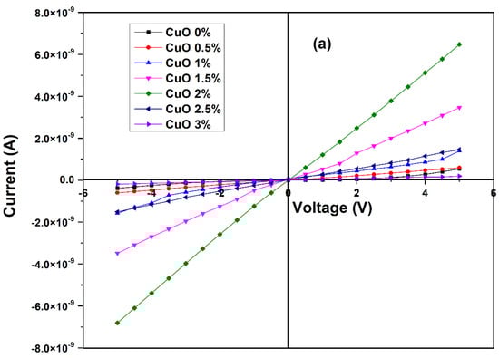 With their special properties, such as a narrow band gap (ranging 1.5–1.8 eV at 300 K) [1], a monoclinic crystal structure, high visible absorption coefficient, and low cost, CuO films attract special interest. These films are good candidates to replace other hazardous materials in solar cell applications [2]. An uncountable number of research articles focusing on CuO films were published in the literature. CuO has been used in various applications such as dye-sensitized solar cells, gas sensors, supercapacitors, field emissions, solar photovoltaic devices, lithium-ion electrodes, and others [3,4,5,6,7,8]. Therefore, CuO films deserve further improvement in their properties, especially their electrical conductivity.