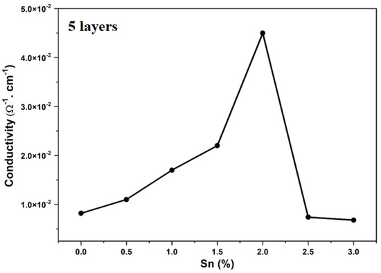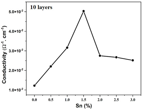 The optimal conductivities for 2.0 at% and 1.5 at% in 5- and 10-layered films are consistent with other film characteristics described above. From Table 1 and Table 2, these films exhibited the lowest thickness values among the series. The lower thickness values indicate higher densification compared to other films. Higher densification is one main reason for improved electrical conductivity, as described earlier for other types of films [31,32]. At Sn doping densities above these values, the film crystallite may involve higher imperfections which lower the conductivity. As stated in Section 3.1 above, the small lowering in crystallinity, with doping, was observed with small changes in the lattice parameters. This could be the reason for the conductivity lowering at higher Sn doping concentrations. In such a case, the crystallite imperfections balance off the dopant concentration effect.