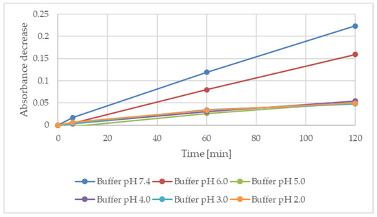 The self-decay of ABTS• was lower at lower pH (Figure 2), confirming the reported higher stability of ABTS• under acidic conditions [17].