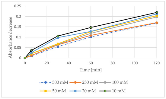 Another approach is based on the comparison of “area under curve” i.e., the sum of ABTS• absorbance values read in successive measurements during the course of reduction, if the measurements are taken in the kinetic loop mode (Figure 9 bottom, Table 2). This approach is less dependent on errors of individual measurements. It is a standard method in the quantification of “oxygen radical absorbance capacity” (ORAC) [9,41,42]. As shown in Table 2, the two approaches brought concordant results.
