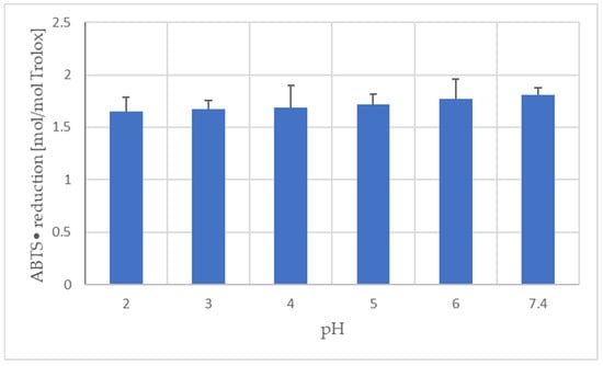 Lowered pH did not affect significantly the reaction of ABTS• with Trolox; there was a tendency for somewhat lower reactivity when pH was lowered but the differences were not statistically significant (Figure 4). A modification has been proposed for the original method presented by Re et al. [13], in which the assay was run at pH 5.8. The author claimed higher stability for ABTS• prepared at pH 3.6 [17]. In our opinion, however, the measurement of antioxidant reaction at physiological pH optimally reflects its reactivity in vivo and prevents undesired reactions (e.g., precipitation) among components of complex samples.