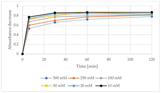 The magnitude of absorbance decrease (initial value of 1.0 minus the actual absorbance) is presented in the plots. Such plots allow for an easier estimation of the percentage of decolorization and show the reaction progress in positive values.