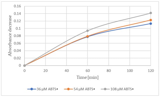 A simple and straightforward way to determine antioxidant activity is to measure the decrease of ABTS• absorbance after a specified time; 6 min as recommended by Re et al. [13] or a different time, as used by some authors (we would recommend 60 min for “slow” antioxidants, blood plasma or plant extracts). However, other parameters can also be used.