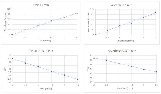 Concentration dependence of ABTS• reduction by ascorbic acid and Trolox (absorbance decrease and AUC after 6 min; absorbance measured every 30 s).