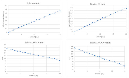 The agreement between the calculations based on the dependence of absorbance decrease and AUC on the extract volume was confirmed for the measurement of the antioxidant capacity of Boletus edulis extract. In this case ABTS• reduction was monitored up to 60 min and was significantly different for 6 and 60 min (Figure 10; Table 3).