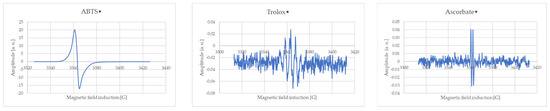 An obvious consequence of one-electron reaction with the ABTS• radical is the formation of a free radical of the reducing compound, which further reacts to form a fully oxidized non-radical form of this compound. When using excess reducing compound with respect to ABTS• (mixing ca 3.5 mM ABTS• solution with an equal volume of 5 mM Trolox or ascorbic acid) and immediately measuring ESR spectra, free radicals of Trolox and ascorbate were detected (Figure 11).