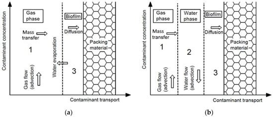Biofiltration process in (a) a biofilter and (b) a biotrickling filter. 1: Contaminant transport in a gaseous phase; 2: contaminant transport in a liquid phase; and 3: contaminant biodegradation.