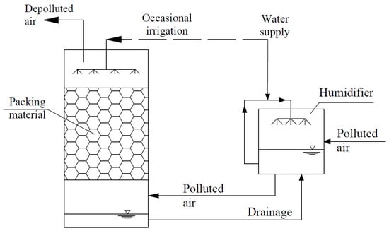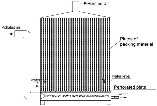 Often open-type or closed-type BFs (Figure 2) have separate inlet gas humidification chambers. Contaminated gases are pre-humidified by spray nozzles in these chambers before entering the BF. At the bottom of the humidification chamber there is a water tank from which water is supplied to the nozzles by a water pump. In some BF constructions, the inlet air is humidified by passing the gas flow through the water layer (bubble saturator) [,]. Moisture (water) also absorbs contaminants from the gas phase during the humidification process. The achieved saturation levels of inlet gas usually reach 90–95% [,]. The air humidified in the chamber is directed to the lower part of the BF, where it is evenly distributed over the entire cross-sectional area of the packing material. To maintain the activity of inoculated microorganisms, the packing material itself is occasionally irrigated with water or a nutrient solution. In most cases, the packing material of BFs is moistened using spray nozzles installed above the packing material. Due to the presence of moisture in the packing material and large contact surface for moisture transfer from packing material to treated gas, and relatively long gas residence time, treated air often leaves the BF with a relative humidity of 100% []. The contaminated gas can also be supplied from the top to the bottom of a BF (descending flow mode) in order to reduce drying of the packing material through airflow [].
