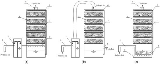 Closed-type biofilters: (a) with separate air humidification chamber and ascending gas flow; (b) with separate air humidification chamber and descending gas flow; (c) with integrated humidification chamber. 1: inlet air duct; 2: inlet gas humidification chamber; 3: distributor; 4: packing material; 5: integrated humidification chamber; 6: packing material humidification system; 7: mesh; and 8: outlet air duct [].