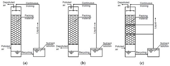 Figure 5 shows schematic representations of BTF configurations. Biotrickling filters use a co-current or counter-current flow of liquid and gas phases []. The main option is to use the counter-current flow of different phases, which is usually convenient for absorption of pollutants. The main issue of using this mode is clogging of the lower part of a BTF (owing to biomass over accumulation), so the co-current mode is sometimes preferred []. In order to reduce uneven biomass or moisture distribution and improve pollutant elimination, several studies used BTFs with directional-switching flow configurations [,]. Wang et al. [] found that such BTF configuration resulted in a higher toluene elimination capacity and helped to avoid clogging of the packing material. In addition, BTF was more tolerant to the changes in the inlet pollutant loadings [].