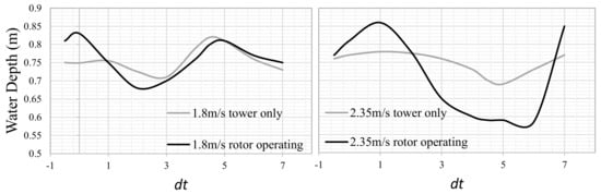 Placement of an HK device extracting energy in confined flow may affect water surfaces and water surface profiles. This is especially true in array schemes, and must be considered to ensure that the clearance between the rotor blades and the surface is sufficient. Myers and Bahaj [12] investigated a 1:30 scale HAHT model (rotor diameter, dT = 0.4 m), and observed a clear difference in the water surface once energy was extracted. Water depths increased immediately upstream of the rotor and decreased downstream for about 2 dT. Details of the water surface profiles can be seen in Figure 1. The results observed a standing wave 7–8 dT downstream (it should be noted that this was for the high-freestream-velocity case).