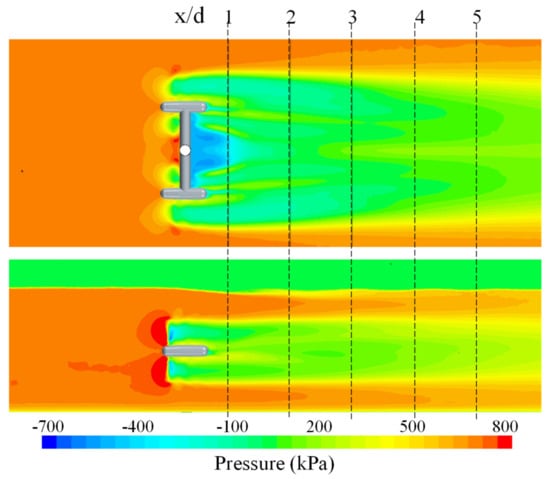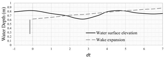 Myers and Bahaj [12] found that when imposing the typical wake expansion on the water surface, this coincided with the increased elevation observed 4–5 dt downstream of the turbine rotor (as shown in Figure 2). In addition, due to the wake expansion coincident with the free surface, cumulative turbine placement at intervals smaller than the recovery length may cause the flow to approach critical depth, causing severe undulations in the water surface profiles (WSPs). Turbine operation and efficiency may also vary due to decreasing fluid velocity over the blades during operation. Accurate quantification of the WSPs around an array may be a challenge due to the multiple effects of turbulence, wake mixing, and superposition of WSP effects [12].