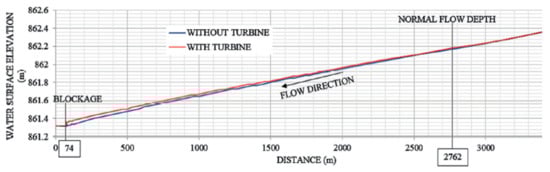 In a study on a pilot HK installation in an irrigation canal, the backwater effect from the presence of the turbine extended up to 2.7 km upstream, due to the flat slope and subcritical flow present in the channel [1] (Figure 3). The clearance coefficient for this installation had not yet been defined. The specific turbine studied in that project contained grids upstream of the turbine, which trapped debris and caused a further increase in the backwater effect, to the point of channel overtopping. The blockage ratio for the installation was around 12.5%.