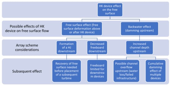 When HK devices are placed in array schemes in inland channels/rivers, the cumulative effect and inter-effect of these devices should be well understood to avoid unfavourable free-surface effects. As shown in the organogram (Figure 5), the blockage resulting from the HK device (in typical subcritical, flat-sloped channels) may have multiple subsequent effects influencing downstream installations (within the array) as well as upstream flow conditions. Neglecting the free-surface effects in high-blockage cases may result in exposed downstream turbines (i.e., freeboard reduced), hydraulic jump formation (enforced critical flow), and upstream damming effects, and may also lead to potential blade-tip cavitation problems. Accurately quantifying the water surface effects is a challenge, and guidelines to avoid unfavourable conditions may be extremely useful.