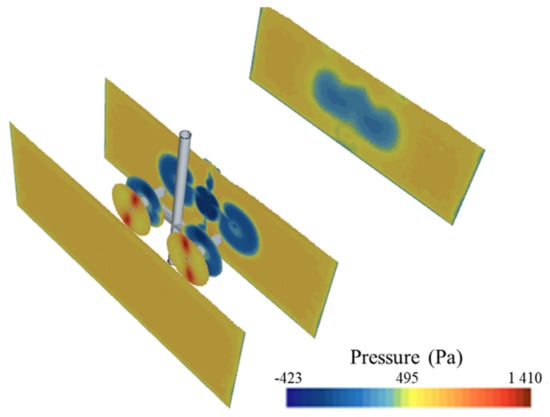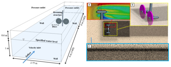 A velocity inlet and downstream pressure outlet were specified as boundary conditions. The laboratory test turbulence and velocity values that were measured experimentally were specified at the inlet. Full development of the boundary layer on all surfaces (i.e., boundary walls, blades, and stanchion) was ensured through the specific turbulence model wall treatment and mesh resolution for each test case (details seen in [40]).