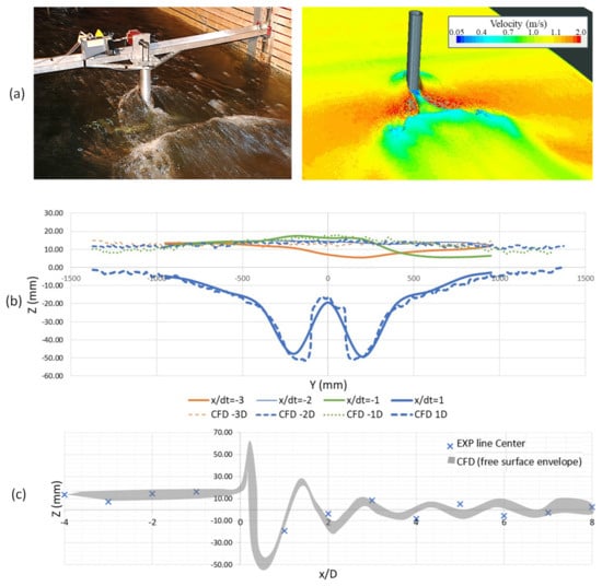 Validation of the modelled wake and performance can be seen in [40]. Due to the importance of the backwater approximation, and correct modelling of the backwater effect caused by the turbine blockage, the free-surface measurements from a multiphase model were compared in this paper. Comparison of the experimental and CFD results can be seen in Figure 7. The results correlated well, with the computed free-surface behaviour fitting well with the experimental tests. The CFD results were recorded over one rotation and plotted as an envelope. The backwater effect was predicted well, with a maximum of 12 mm damming occurring upstream.