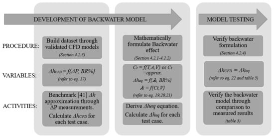 The primary objective of the development of a backwater model is to allow a usable model with only basic inputs required. Thus, a mathematical formulation based on existing models, basic hydrodynamic principles, and a set of recommended assumptions (where/if information is not yet available) was carried out. The workflow for the backwater model’s development can be seen in Figure 8, and is explained in the following subsections.