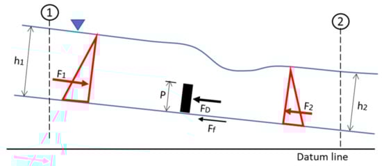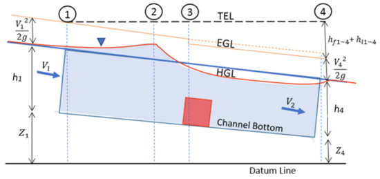 A previous study [21] attempted to determine the backwater curve for instances when either the cross-section varied, the channel slope changed, or there was an obstacle in the channel and gradually varied flow was present. The model was based on the Bernoulli equation between two cross-sections. The energy loss between the cross-sections (related to distance) was termed the hydraulic loss, I, which can be calculated as follows: