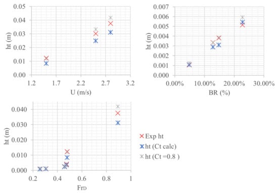 The MAE () and variance values calculated for various scenarios are shown in Table 5. The variations between experimental and approximated ht for variations in blockage ratio (BR) velocity (U) and FrD are shown in Figure 14.