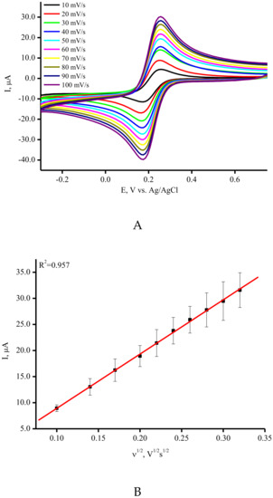 Cyclic voltammetry (CV) measurements were used to assess the electroactive surface area of the modified SPE/SWCNTs. Figure 2A demonstrates the CV profiles for the ferri/ferro cyanide [Fe(CN)6]3−/4− redox probe with a couple of well-defined redox peaks for SPE/SWCNT. The linear dependence of the peak current versus the square root of the scan rate was found and confirmed as a diffusion-controlled process (Figure 2B) [42]. The anodic/cathodic peak currents for the SPE/SWCNT have much higher intensities than bare SPE with a lower ΔE peak-to-peak separation (Figure 2C). This indicates that a more reversible redox performance of [Fe(CN)6]3−/4− occurs when CNTs are used. SPE/SWCNTs possess a larger specific surface area according to the Randles–Sevcik equation [42]. The calculated values of the specific surface area corresponded to 0.0024 cm2 and 0.1258 cm2 for SPE and SPE/SWCNT, respectively. These results confirmed the good conductivity and electron transfer properties of carbon nanomaterials such as carbon nanotubes [14,39,40,41,42].