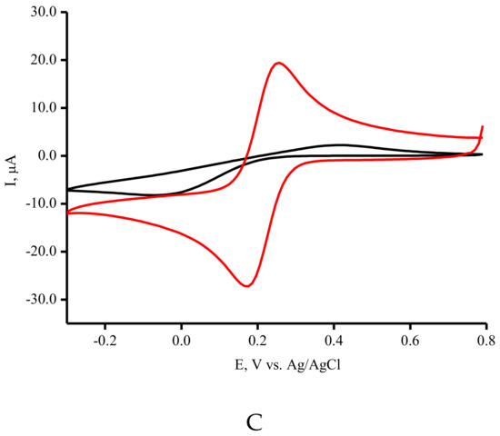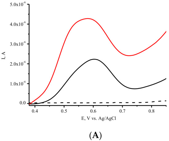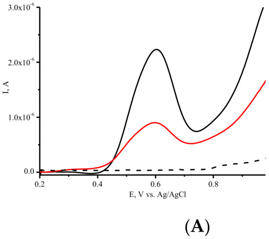 Screen-printed electrodes (SPE) with graphite working (geometric area 0.0314 cm2), auxiliary electrodes, and silver/silver chloride reference electrodes (Ag/AgCl) were obtained from ColorElectronics, Moscow, Russia (http://www.colorel.ru) (accessed on 16 June 2022).