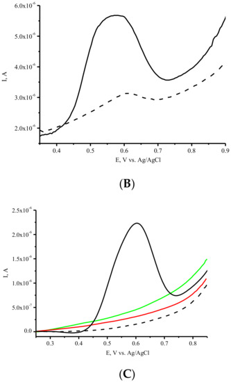 The second scan of DPV for ASNase on SPE/SWCNT revealed a lower peak current intensity, thus confirming the irreversible nature of amino acid electrooxidation (Figure 3B).