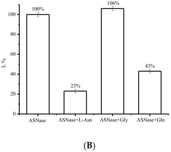 Estimation of ASNase catalytic activity is based on different approaches, such as the determination of L-Asn content or ammonia concentration measured by high-performance liquid chromatography (HPLC), direct amino acid quantification by circular dichroism (CD) [8], electrophoresis assays, and determination by a colorimetric assay from complexation with hydroxylamine [1]. The simultaneous production of L-aspartic acid (L-Asp) and NH4+ cations can also be used to quantify ASNase activity by conductometry, where the increase in conductivity corresponds to the rate of product formation [8,9]. The most commonly used Nessler reaction with potassium tetraiodine mercurate (II) K2HgI4 requires using highly toxic reagents with poor stability. In addition, the Nessler reaction has low reproducibility and complicated operations and is not suitable for detecting clinical samples [6]. From these viewpoints, sensitive, reliable, and robust methods of determination and catalytic activity monitoring of L-asparaginase are in great demand.