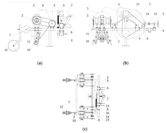The deep-hole liquid fertilizer applicator. (a) side view. (b) rear view. (c) top view. 1. frame assembly; 2. liquid fertilizer injecting control mechanism; 3. liquid fertilizer feeding main pipeline; 4. sprocket A; 5. main drive shaft; 6. liquid fertilizer pump; 7. three-point suspension assembly; 8. worm gear reducer; 9. power input shaft assembly; 10. helical spur gear binding mechanism; 11. liquid fertilizer feeding branch rod; 12. ground wheel assembly; 13. main drive belt; 14. sprocket B; 15. sprocket C; 16. sprocket D.