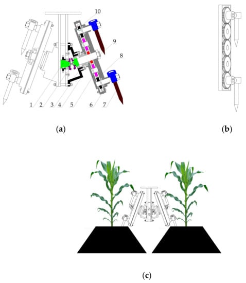 - Hu, H.; Li, H.; Wang, Q.; He, J.; Zhang, Y.; Chen, W.; Wang, X. Design and experiment of targeted hole-pricking and deep-application fertilizer applicator between corn rows. Trans. Chin. Soc. Agric. Eng. 2016, 32, 26–35. [Google Scholar]