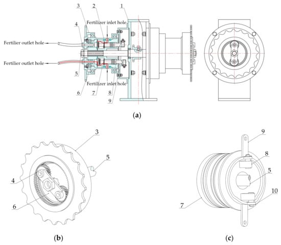 The liquid fertilizer application control mechanism is designed to achieve the goal of efficient and low-loss fertilizer delivery. The mechanism can be directly connected to the hose interface of the fertilizer injecting needle, which reduces the loss of fertilizer during the fertilizer delivery process [26,27]. The mechanism mainly consists of a sprocket shaft housing, a sprocket shaft, a spindle sleeve, a sub sleeve, a planetary wheel, an inner gear ring, a top bar, an outer housing, and a cylindrical hollow cam [28,29,30].
