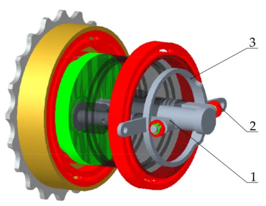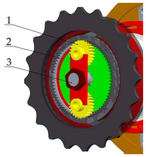 The number of teeth in the inner ring and the planetary wheel are 75 and 25, respectively, so that the angular velocity of the planetary wheel is zero, the ratio of angular velocity between the sprocket axis, and the inner ring is 3:2. The three-dimensional structure of the mechanism is shown in Figure 7.