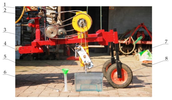To analyze the fertilizer injecting performance of this fertilizer sprayer, we conducted bench tests on the differential two-way fertilizer supply distribution device and the drilling mechanism. The test was conducted on 6 April 2020 in an open space outside the agricultural and animal husbandry laboratory of Northeast Agricultural University, Xiangfang District, Harbin City, Heilongjiang Province (126°43′48″ N, 45°44′56″ E). To analyze the working performance and the rationality of the design of the distribution device, fertilizer injecting performance and energy saving tests were conducted. The main equipment used for the tests is shown in Table 1 and Figure 10.