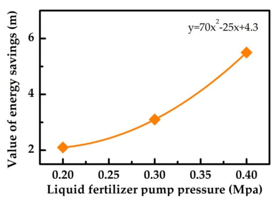 The flow velocity at the outlet of the liquid fertilizer pump is calculated by Equation (3), where the cross-sectional diameter at the outlet of the liquid fertilizer pump is 11 mm, and its values are 1.8, 2.1, and 2.5 m s−1. The total head loss of liquid fertilizer with pressure for the entire piping system had values of 9.0, 12.6, and 15.0 m. The total head loss values of the liquid-fertilizer rotor-type converter were calculated to be 11.1, 15.7, and 20.5 m. The calculated energy saving values of the piping system for the differential two-way fertilizer supply distribution device are 2.1, 3.1, and 5.5 m. The relationship between energy saving and liquid fertilizer pump pressure is obtained, as shown in Figure 12.