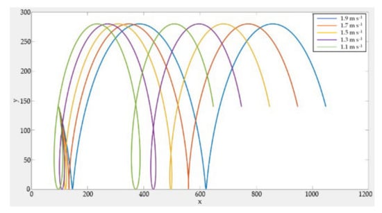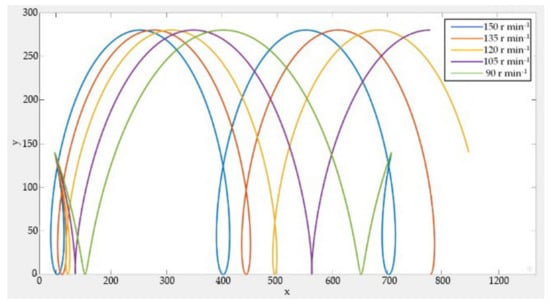 To investigate the effect of forward speed and drilling speed on hole width and hole spacing, the machine was tested in the field at different forward speeds. The fertilizer needle drilling motion combines two motions [35,36]: one is a circular motion when the drilling mechanism rotates, and the other is a linear motion when the machine keeps moving. When the trajectory of the fertilizer injection needle is a “short pendulum”, the hole width is the distance between the in-soil and out-soil points of the needle body. When the trajectory of the fertilizer injection needle is a “trochoid”, the hole width is the maximum chord length of the trajectory of the needle body into and out of the soil [36]. Figure 13 shows the drilling trajectory of the fertilizer injecting needle under the action of forward speed of 1.1–1.9 m s−1, when the drilling speed is 120 r min−1. As the forward speed increases, the hole width first decreases and then increases, and the hole spacing gradually increases. Figure 14 shows the drilling trajectory of the fertilizer injecting needle under the action of 90–150 r min−1, when the forward speed is 1.5 m s−1. As the drilling speed increases, the hole width decreases and then increases, and the hole spacing gradually decreases.