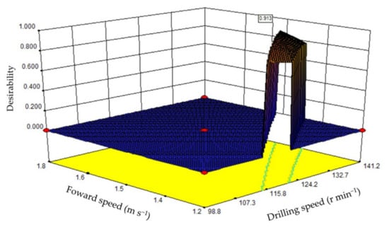 We can see that the interaction between the drilling speed and forward velocity is significant. These results were consistent with a finding proposed by Hu, Li, Wang, He, Zhang, Chen and Wang [4], Gaowei et al. [39]. Finally, the test data were optimized to obtain an optimal range of operating parameters. The constraint conditions were Y1 = min, Y2 = 300–320 mm, X1 = 90–150 mm and X2 = 1.1–1.9 m s−1, as shown in Figure 15. When the working speed and advance speeds were 127 r min−1 and 1.40 m s−1, respectively, the performance of the drilling mechanism was optimal, with a hole width of 39.9 mm and a hole spacing of 320 mm.