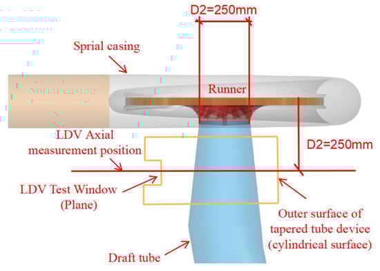 According to the IEC Hydraulic Machinery Model Test Standard, the pressure transducer should be placed at 0.3 to 1 times the diameter of the flow path of the conical section of the draft tube for the pressure pulsation test with the draft tube of the Francis pump turbine model. The axial test position in the LDV test is shown in Figure 1. The downward axial position at the center line of the guide vane is the runner outlet diameter, D2, while the circumferential position is perpendicular to the center end face of the draft tube.
