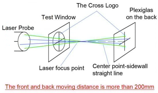 To ensure that the laser focusing point moved along the radial line from the center point to the sidewall during measurement, the positions of the green and blue lights were repeatedly adjusted in the vertical and horizontal directions before the measurement. Meanwhile, the “cross” positioning mark of the LDV measurement window of the tapered tube section was used to locate the position, and the coordinate frame was moved back and forth by at least 200 mm. Alternatively, the height of the coordinate frame was adjusted to ensure that the green-light path was on the vertical line of the cross mark of the front and rear Plexiglass and that the blue-light path was on the horizontal line of the cross mark of the front and rear Plexiglass. This is illustrated in Figure 5. The coordinate frame was fixed to prevent it from moving during measurement.