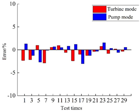 The error distributions of the integrated flow rate and flow meter flow rate under a 14° opening degree of the turbine working condition and the pump working condition were counted, and 15 comparisons were made for the high-efficiency zone of the turbine and the high-efficiency zone of the pump, respectively, as shown in Figure 6. The errors were all within 5%, which was considered to fully meet the test accuracy requirements.