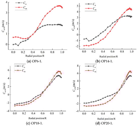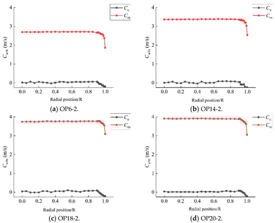 The flow inside the draft tube was stable under pump conditions, and the distributions of the circumferential and axial velocities over the test radius are shown in Figure 11.