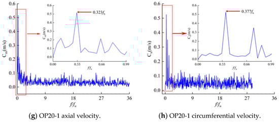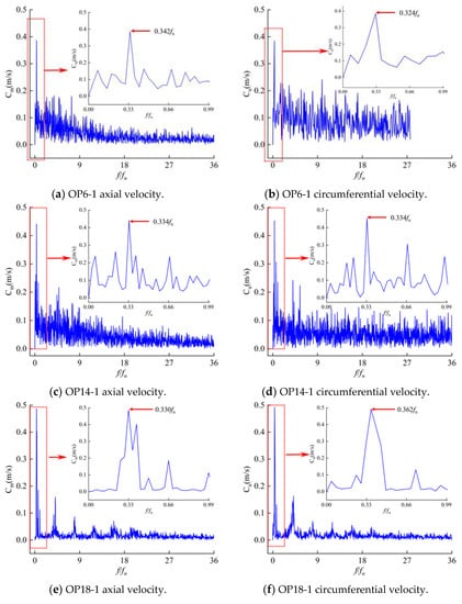 It was found that the axial velocity pulsation and circumferential velocity pulsation exhibited strong regularity; therefore, the transient axial velocity and circumferential velocity at each working point under the turbine working condition were subjected to fast Fourier transform to analyze the spectral characteristics of the velocity pulsation. The velocity pulsations under turbine working conditions are shown in Figure 8, where the test point is 0.5 R.
