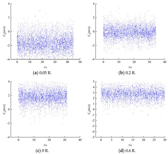 In the center of the draft tube, the circumferential velocity was affected by the vortex rope in the opposite direction of the rotating wheel, while the circumferential velocity at the measurement points far from the center was in the same direction as the rotating wheel; the scatter diagram of the circumferential velocity at different measurement points of OP6-4 is shown in Figure 9. In the figure, it can be observed that, in the range of OP6-4, 0–0.4 R, the direction of circumferential velocity gradually changes to become the same as the runner direction of rotation as the distance between the measurement point and the center increases. After 0.4 R, the direction of circumferential velocity is almost entirely in the runner direction of rotation, indicating that the affection range of the draft tube vortex rope in OP6-4 is 0–0.4 R. The influence range of the draft tube vortex rope is related to the opening degree in OP14-4, OP18-4, and OP20-4; the influence range of vortex ropes found by the velocity distribution of circumferential velocity was 0~0.25 R, 0~0.3 R, and 0~0.3 R, respectively.
