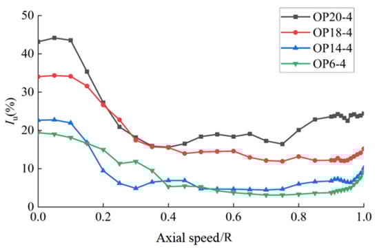 In Figure 10, it can be observed that the turbulence intensity in the center region of the draft tube increased with the increase in opening degree. This occurred because the draft tube vortex rope was in the center of the draft tube at large opening degrees. As the opening decreased, the eccentricity of the draft tube vortex rope increased, making the range of the vortex rope influence larger. It reached the maximum range of 0~0.4 R at an opening of 6°, which is consistent with the phenomenon shown in Figure 9. It was also found that the turbulence intensity increased in the region close to the draft tube wall because the decrease in the average circumferential velocity near the boundary layer was larger than the decrease in circumferential velocity pulsation.