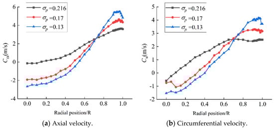 In Figure 12, it can be observed that different cavitation coefficients cause the mean circumferential velocity and mean circumferential velocity distribution on the test radius of the draft tube to change. This is because a change in the cavitation coefficient changes the diameter and eccentricity of the vortex rope, which changes the influence range of the vortex rope. It can be observed that, as the cavitation coefficient decreases, the negative range of circumferential velocities increases: the range affected by the rotation of the vortex rope increases, and the negative range of axial velocities increases, i.e., the range of backflow areas in the draft tube increases.