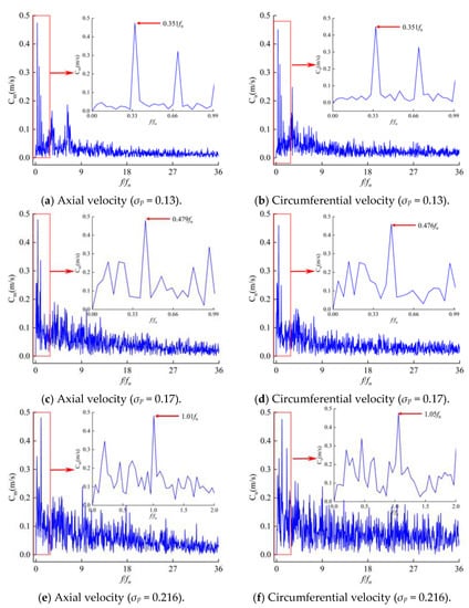 The fast Fourier transform of the circumferential and axial velocity pulsations on the test radius of the draft tube with different cavitation coefficients is shown in Figure 13 (test point is 0.5 R). In the figure, it can be seen that the cavitation coefficient has a direct effect on the velocity distribution in the draft tube. The vortex rope range and resonance between the vortex rope cavity and water body increase the principal frequencies of the axial and circumferential velocities with an increase in the cavitation coefficient.