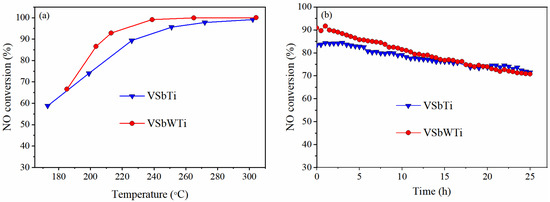Figure 1a depicts the NH3-SCR activities of VSbTi and VSbWTi monolithic catalysts. With the introduction of WO3, the VSbWTi catalyst exhibits higher NOx conversions at temperatures below 300 °C. The NOx conversion reaches 90% at ca. 210 °C and 230 °C over VSbWTi and VSbTi, respectively. Because V-based catalysts produce little N2O at low temperatures [41,42], the product from NOx conversion is nearly 100% N2 in the reaction. To measure the durability of the monolithic catalysts, a SO2 resistance test was performed at 220 °C after the NH3-SCR activity test, and the results are portrayed in Figure 1b. It is readily anticipated that the initial NOx conversions in Figure 1b would be slightly lower than those in Figure 1a at the same temperature since the catalysts have been aged during the NH3-SCR activity test. Compared with VSbTi, the VSbWTi catalyst deactivates more rapidly upon exposure to SO2 and H2O. After poisoning for 25 h, a drop of 12% in NOx conversion occurs over VSbTi catalyst while VSbWTi exhibits a more evident decrease of 20%, so the poisoned catalysts indicate similar NOx conversion (71–72%) at the end of the test. In real applications, the poisoned catalysts would undergo vapor washing and thermal regeneration when the NOx conversion fell beneath a threshold value (e.g., 70%, depending on operation conditions). These results indicate that the introduction of WO3 to VSbTi catalyst leads to higher deNOx activity in the fresh state but lower sulfate tolerance.