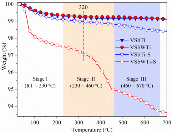 The sulfates deposit on the catalysts were quantified by TG and the profiles are portrayed in Figure 4. The weight loss data are summarized in Table 1. Fresh catalysts only indicate one significant weight loss stage (Stage I), which is associated with the desorption of surface-adsorbed H2O. Aside from this, sulfated catalysts display two other typical weight loss features (Stages II and III), and their weight losses in Stage I are larger than those of fresh counterparts due to H2O and NH3 adsorption during the sulfation treatment. Combining the MS results with the previous studies [40,62], the weight loss in Stage II should be assigned to the decomposition of ammonium sulfates, and that in Stage III can be ascribed to the decomposition of metal (i.e., V, Sb, Ti and W) sulfates. As listed in Table 1, the amount of ammonium sulfates and metal sulfates deposited on VSbWTi-S is about 9 and 3 times of that on VSbTi-S, respectively. This implies that WO3 modification significantly accelerates the sulfate deposition on the catalyst, in accordance with the MS results.