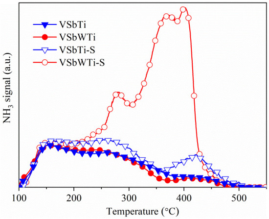 Figure 6 portrays the NH3-TPD curves of the catalysts. Both fresh catalysts exhibit similar desorption curves, illustrating that the introduced WO3 has little effect on the surface acidity of the catalyst. After sulfation, the amount of total NH3 desorption increases by 36% for VSbTi-S and 223% for VSbWTi-S. This can be explained primarily by the deposited sulfates that can also serve as acid sites [65,66]. Additionally, the decomposition of ammonium sulfates deposited on the catalyst surface contributes to NH3 production during NH3-TPD measurement, as clarified by MS analysis (Figure 3). The significantly increased NH3 desorption of VSbWTi-S consolidates that W modification has a detrimental impact on the SO2 resistance of VSbWTi catalyst that much more sulfates deposit on the W-modified catalyst upon sulfation.