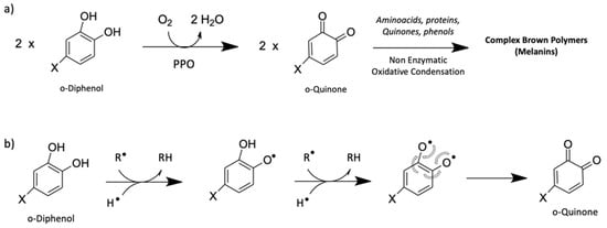 6]. The resulting oxidized products, called benzoquinones, are unstable species that undergo further reactions with nucleophilic substances such as phenols, amino acids, or proteins, producing complex polymers, known as melanins, which are responsible for the browning effect [